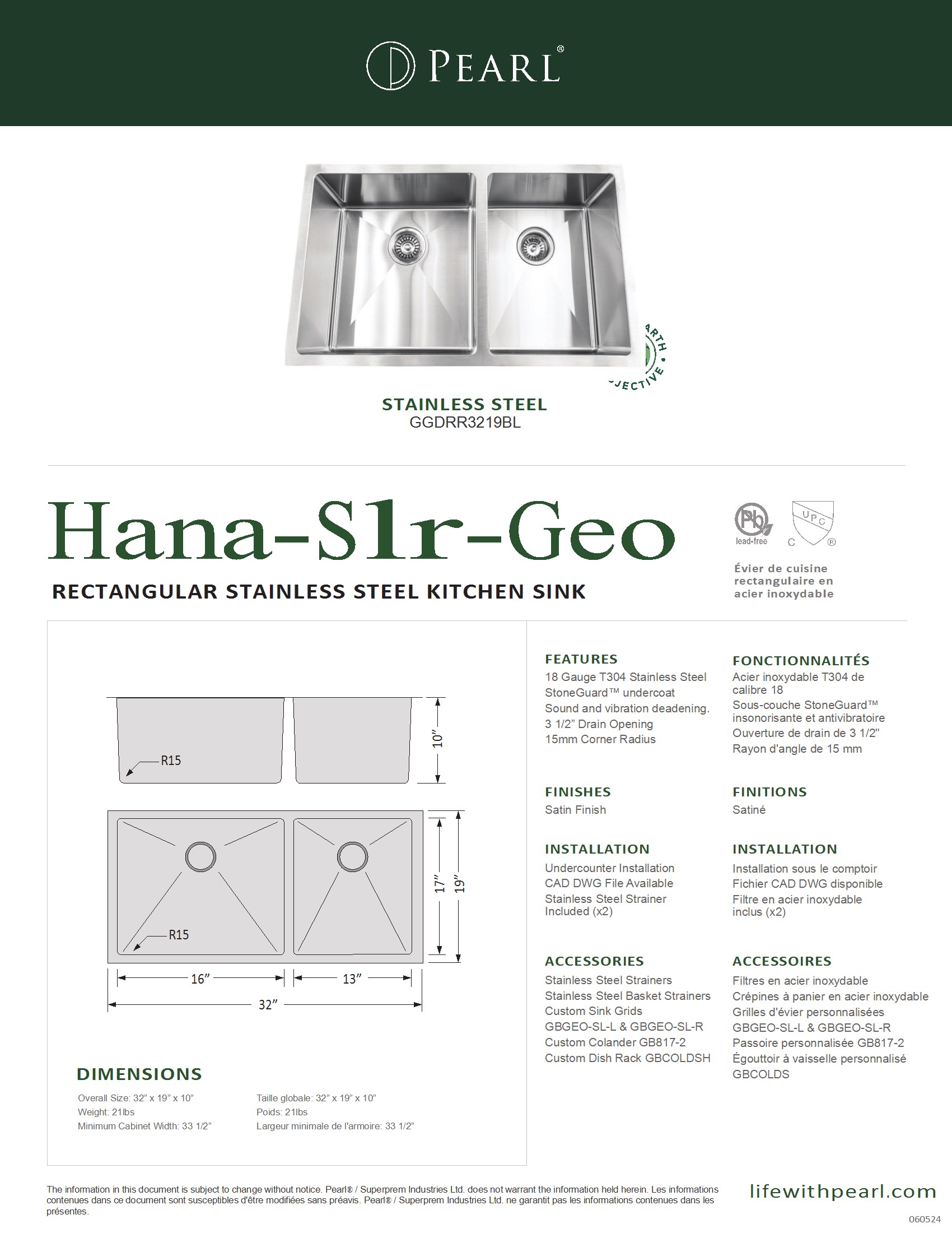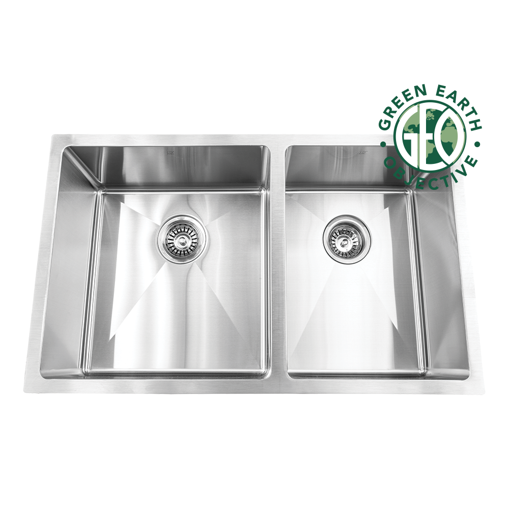 Undermount eco-friendly double offset bowl kitchen sink, built with 18 gauge stainless steel. Its hand-crafted rounded corners maximize your freedom of movement and provide easy maintenance. Using the same manufacturing technique as PEARL’s popular HANA Series to create high quality, sustainable sink line.