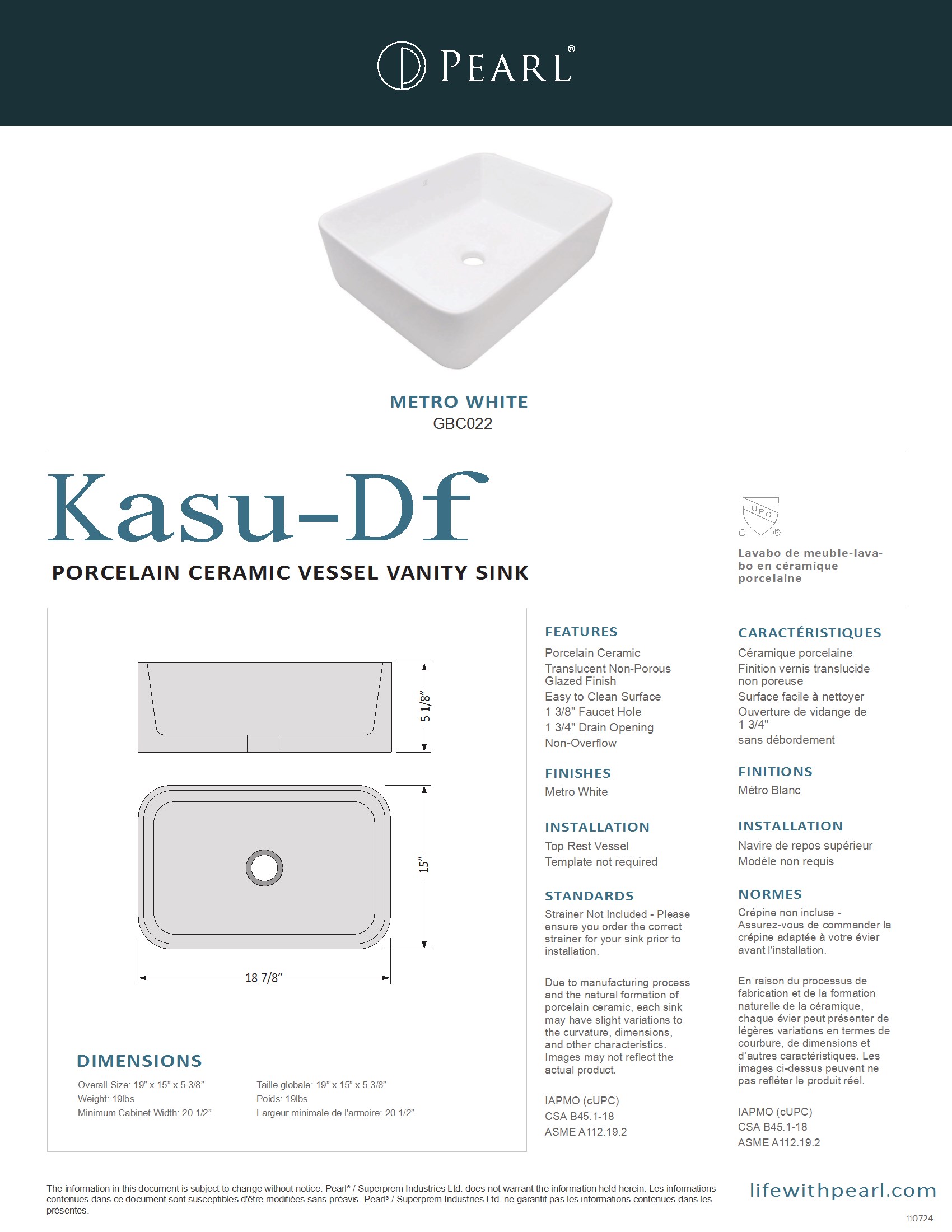 Le KASU-DF est un évier rectangulaire. Il est fabriqué en céramique ignifugée résistante aux rayures et fini en blanc métro. Son design à la fois moderne et polyvalent en fait le lavabo idéal pour toute salle de bain ou salle d’eau. Les éviers Pearl sont construits pour durer, sont assortis d’une garantie à vie exceptionnelle et bénéficient du service à la clientèle inégalé de Pearl Canada.